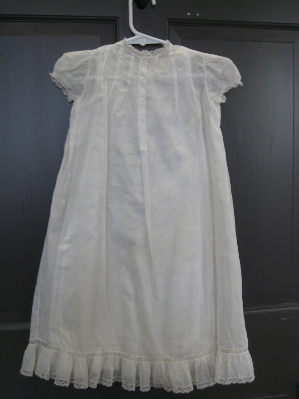 Are you seeing where I am going with this story? I bet you are. Karen told me she had baby clothes from her grandparents and asked me if I would be interested in having them. (She had been told by Susan that I was 'into' that kind of thing.) Of course, I said YES! She explained to me that she had no children and was not 'into' the baby clothes thing, so she would love for me to have them. OMG....was I all over that! She also said they needed to be cleaned, but she had no idea how to do it. Of course, she was thinking they were just so delicate, they must require great care in cleaning. When I first saw them, I knew I could handle the cleaning and couldn't wait to do so.