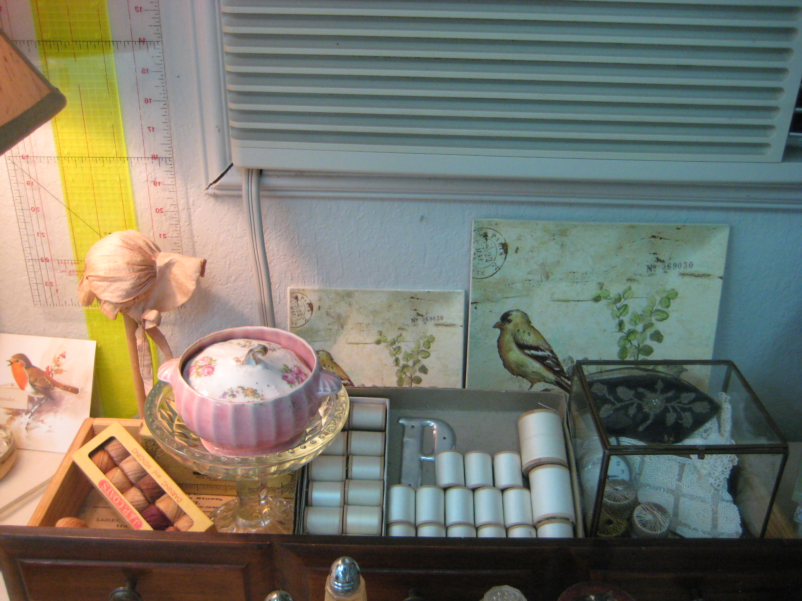 In the tray, are old spools of thread...still 'good,' a glass box with that little white beaded purse I showed you before....and some bird decorative squares from Hobby Lobby. That vintage pink dish is going to turn into a pincushion some day...and the lids in it are from long lost somethings...I have three alike...now why did I buy those? Don't know, they just said something to me!