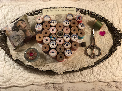 And, why not play with it now and again, I thought. Also, You Have My Whole Heart, one of my favorite expressions kept popping into my mind....so, I tried to make a heart from the spools. It's not as easy as it looks if you ask me.....but here you see the result of my effort.